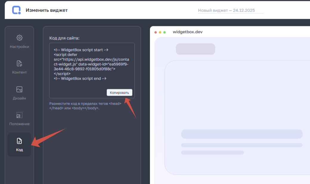 Перейдите на страницу редактирования нужного виджета, выберите раздел «Установка виджета». Далее скопируйте код нажав на соответствующую кнопку.