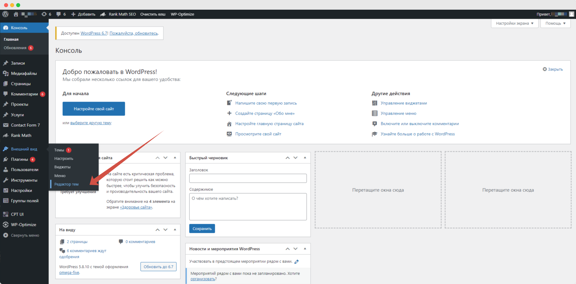 Авторизуйтесь в панели администрирования вашего сайта на CMS WordPress, кликните по ссылке «Внешний вид» - «Редактор тем».