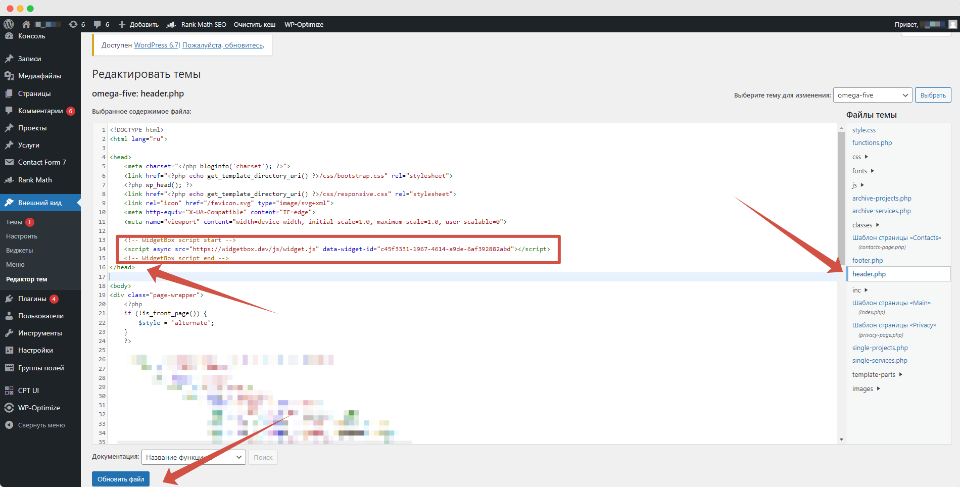 Далее нужно нажать на ссылку «header.php», тем самым открыв этот файл. Затем найдите закрывающий тег </head> и перед ним вставьте ранее скопированный код. После внесения изменений, не забудьте нажать кнопку «Обновить файл».