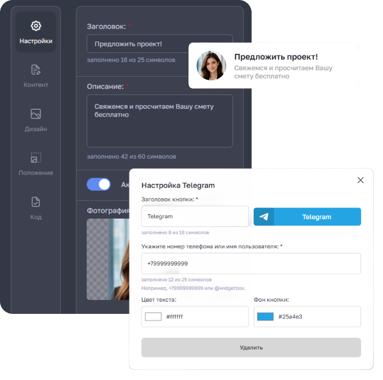 Настраивайте внешний вид, контент и поведение виджета под задачи бизнеса. Все параметры доступны в удобном интерфейсе.