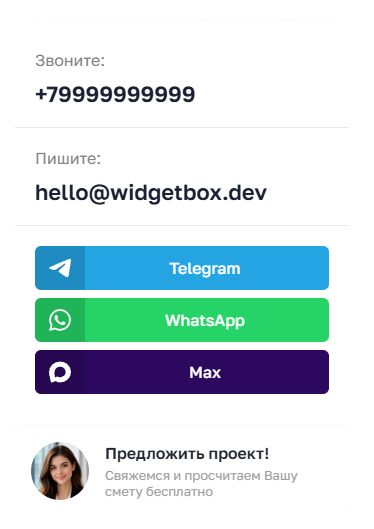 Готовый виджет для контакта с вашими клиентами, который устанавливается за несколько минут и сразу начинает приносить результат. Он повышает конверсию, корректно работает на любых сайтах и устройствах, не перегружает страницу и остаётся дружественным для посетителей.